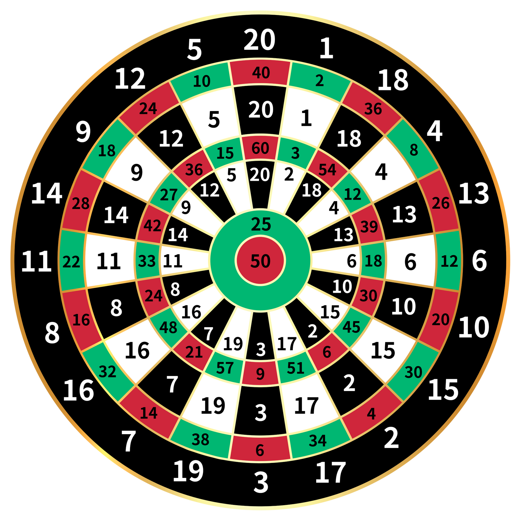 Visual guide of the dart board and points within it. + A red green colorblind friendly version.